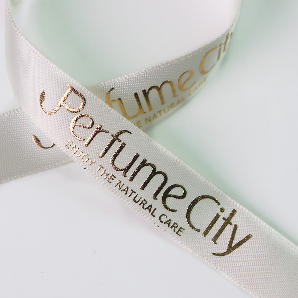Item: customize gold foil logo printed satin ribbon